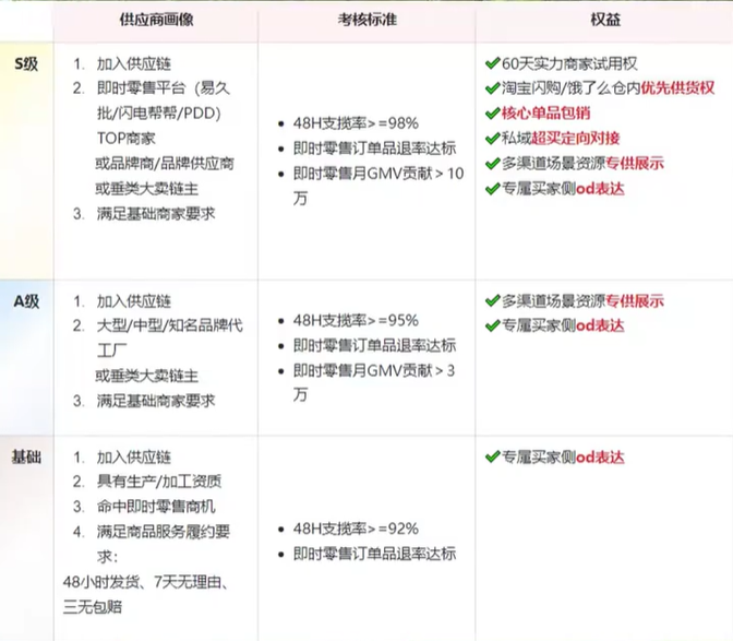 首先说说大家最关心的,如何让产品上闪购,需要满足4个硬性条件:1.要符合即时零售商机;2.要支持48小时发货;3.要支持7天无理由退换货;4.要有三无包赔服务。