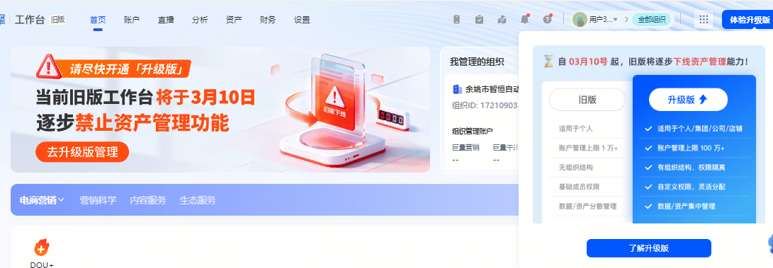 3月10日起,旧版工作台的资产管理功能将正式禁用,6-7月旧版将彻底下线。如果没有及时调整,不仅影响你原来的广告计划,还会导致资金管理不便。所以这几天一定要记得把工作台升级一下。