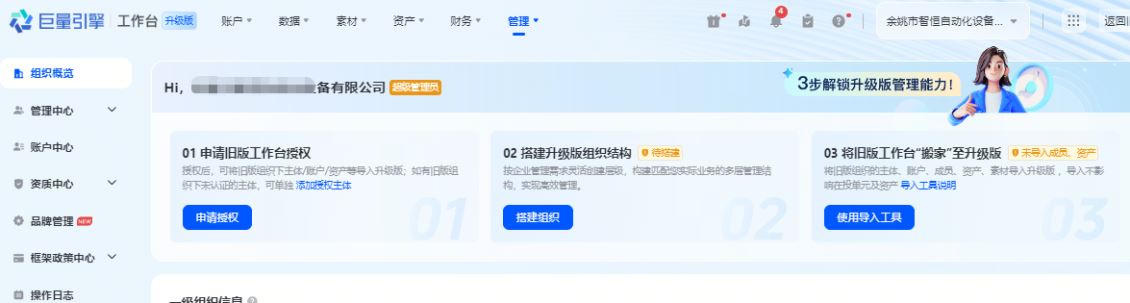 1.完成账号迁移。升级后的组织账号,记得要绑定你原来的广告账号,这样原来的素材、资质、商品库等,才能被调用过来。